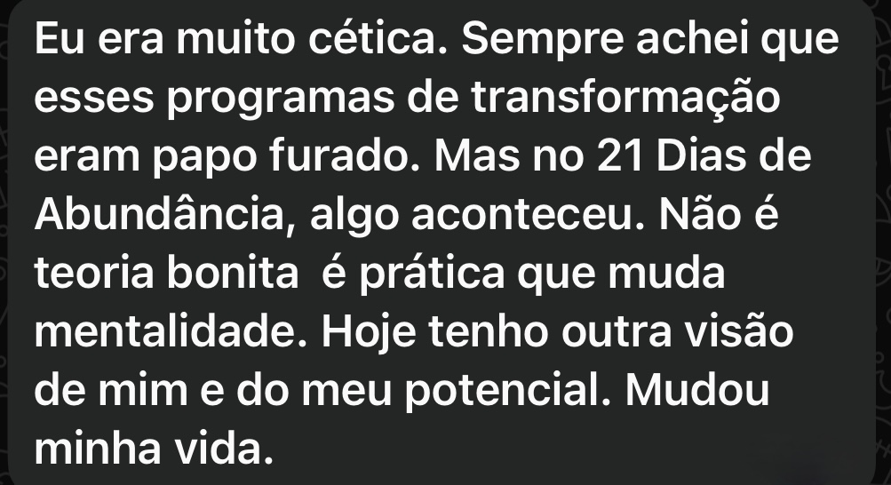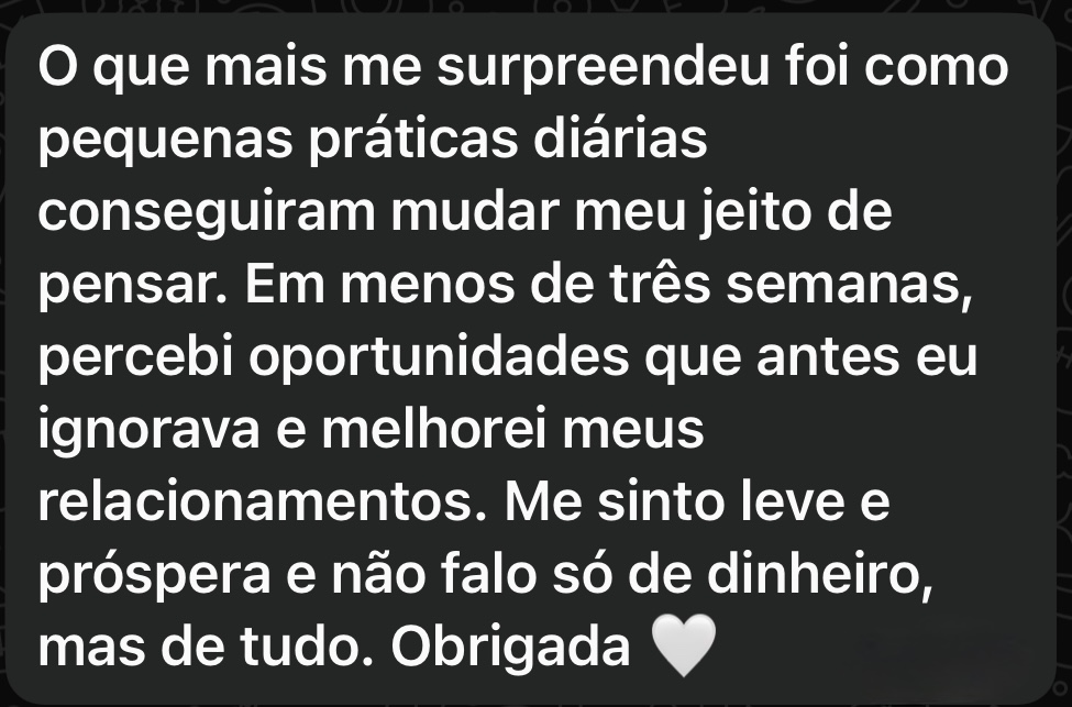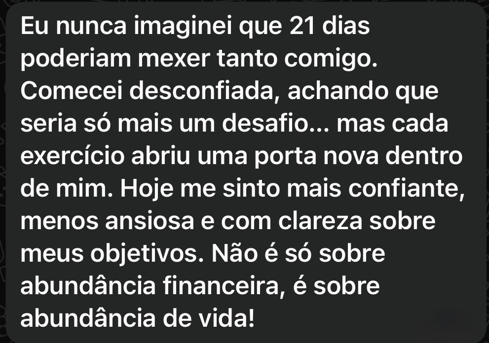 Sim, o “21 Dias de Abundância” é totalmente adequado para iniciantes no desenvolvimento pessoal. Ele foi pensado justamente para quem está começando essa jornada e deseja dar o primeiro passo com segurança, clareza e profundidade. O programa traz uma linguagem acessível, exercícios simples e práticas guiadas, que não exigem nenhum conhecimento prévio. Ao longo dos 21 dias, a pessoa é conduzida de forma leve e estruturada por reflexões, meditações e técnicas de reprogramação mental que ajudam a: