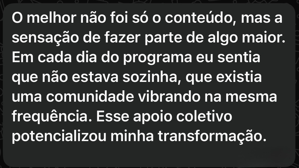 Acreditamos profundamente na transformação que esse programa pode gerar, mas também respeitamos o seu momento e sua decisão. O seu compromisso é com a sua evolução — e o nosso, é garantir que você tenha uma experiência segura, leve e transformadora.
